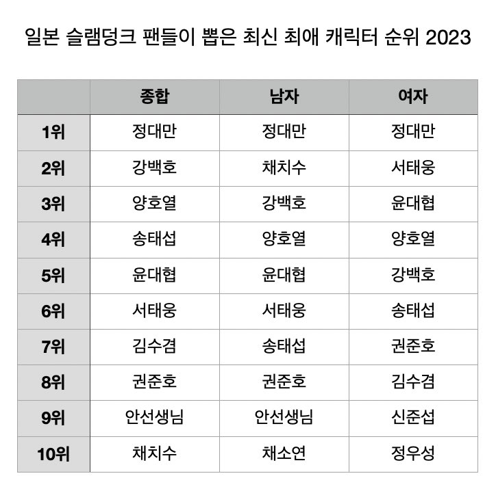 2023년 슬램덩크 인기투표 여자남자별 부문 1위...통합 1위....
